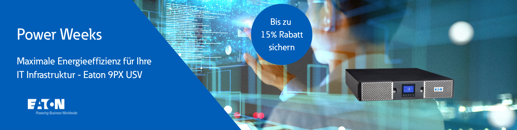 Eaton 9PX USV: Bis zu 40% weniger Energieverbrauch, Leistungsfaktor 1 und 15% Rabatt bis 31.12.2025 – ideal für IT und Rechenzentren.