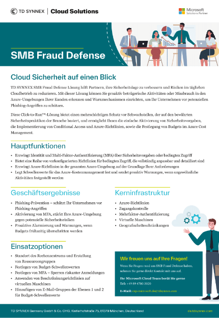 TD SYNNEX SMB Fraud Defense verbessert die Sicherheitslage von KMU-Kunden und reduziert Cloud-Risiken. Die Lösung erkennt proaktiv betrügerische Aktivitäten in Azure-Umgebungen und schützt vor Phishing-Angriffen.